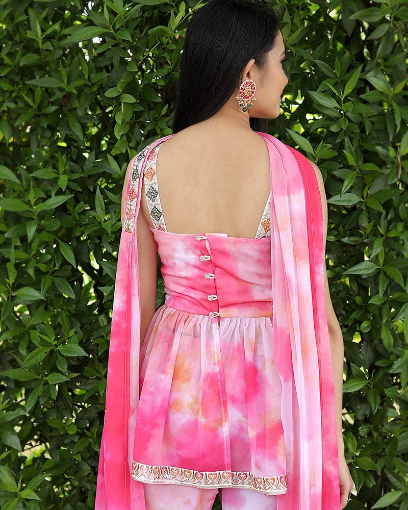 This enchanting three-piece sharara suit exudes elegance and charm in every stitch. Crafted from delicate baby pink georgette fabric, it drapes gracefully, enhancing femininity with its soft hue. Intricate embroidery work adorns the ensemble, adding a touch of opulence to its ethereal appeal. The ensemble comprises a flowing kurta, complemented by voluminous sharara pants, and a coordinating dupatta, completing a timeless look that's perfect for special occasions. Flaunt sophistication effortlessly in this mesmerizing creation.