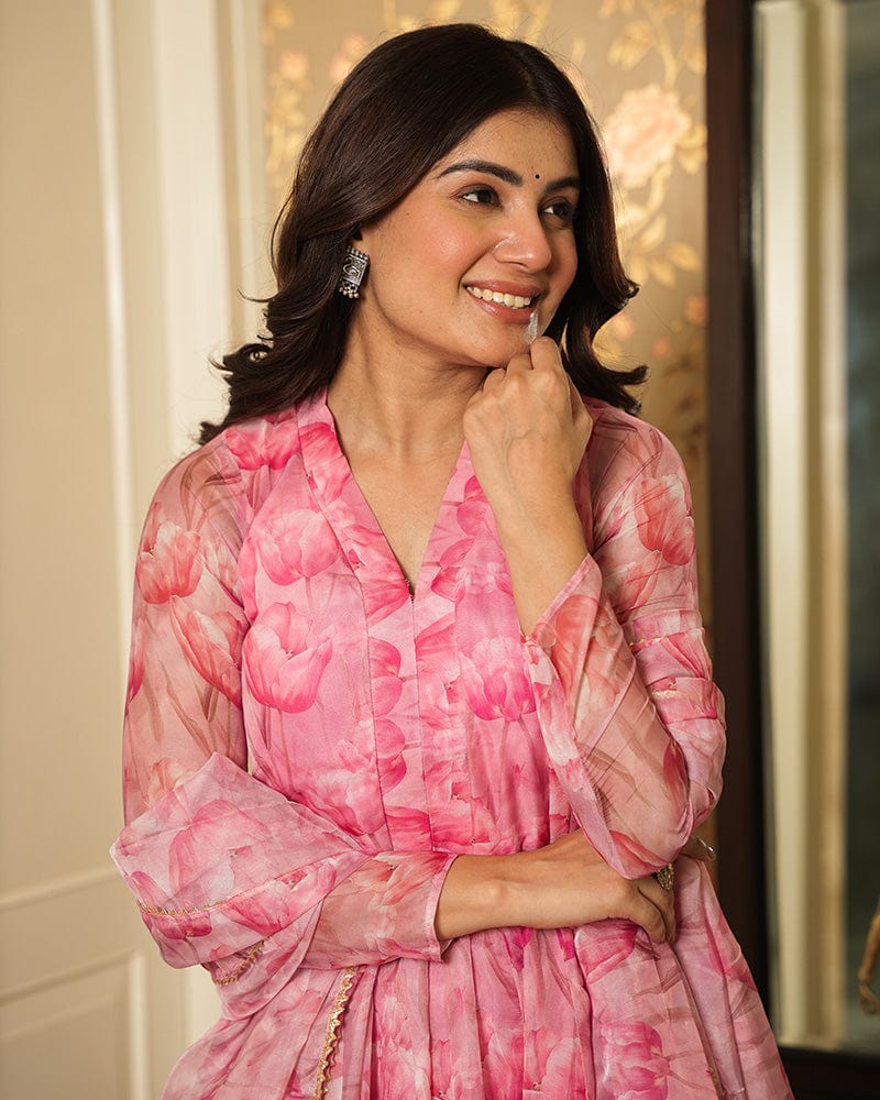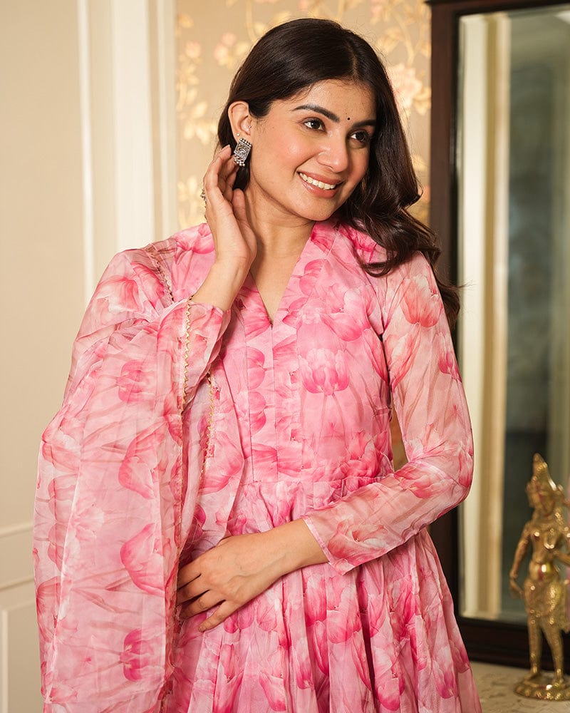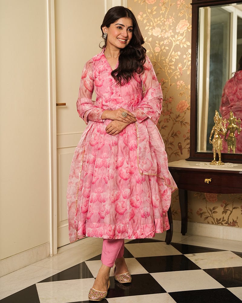 Baby Pink Color Printed Tebby Organza Three Piece Anarkali Suit
