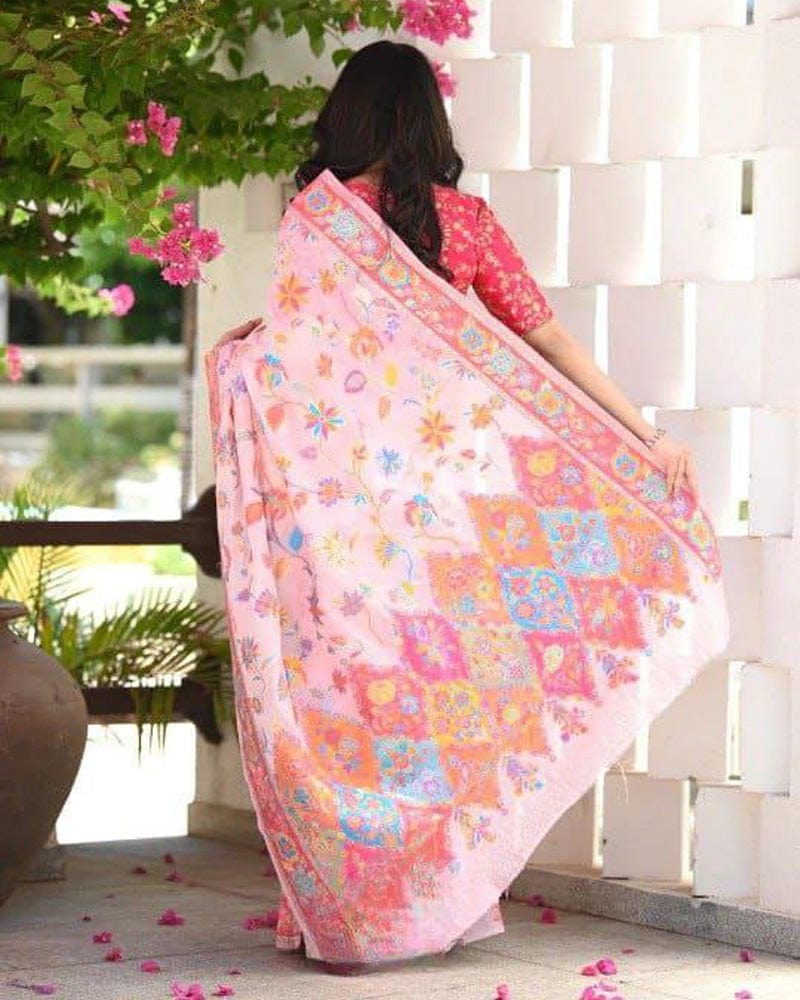 Drape yourself in timeless elegance with this Baby Pink Banarasi Soft Silk Saree. Crafted from luxurious soft silk, the saree flows gracefully, embodying a perfect blend of tradition and contemporary charm. The gentle baby pink hue adds a touch of femininity and sophistication, making it an ideal choice for various occasions. Adorned with intricate Banarasi detailing, the saree is a celebration of cultural richness. Paired with an unstitched blouse piece, this ensemble offers the flexibility to customize your look. Whether it's a festive occasion or a special event, the Baby Pink Banarasi Soft Silk Saree is a symbol of refined grace, promising to make you stand out with its exquisite design and delicate craftsmanship.