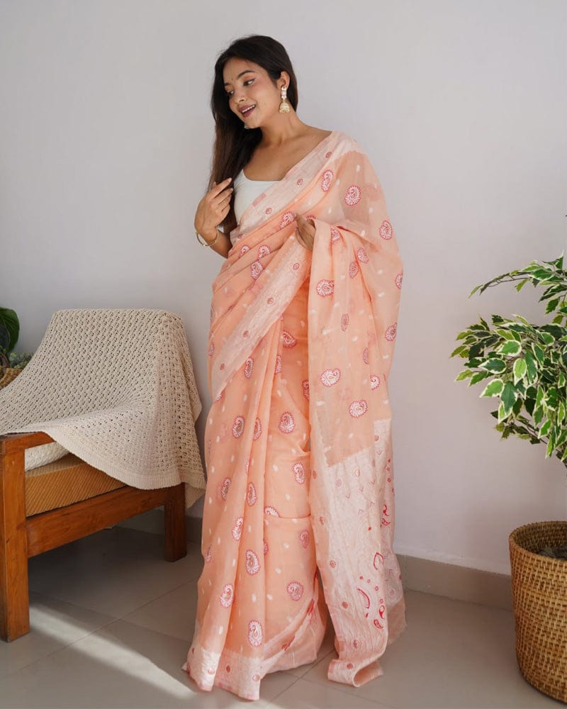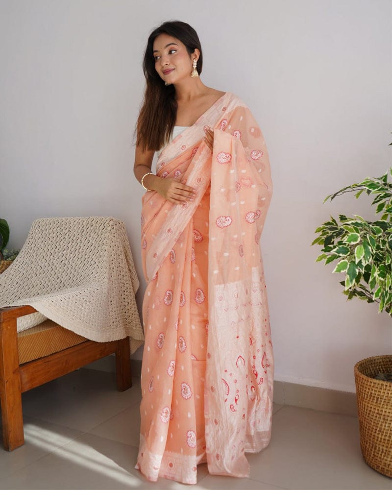 Elevate your grace with this Beautiful Peach Soft Cotton Saree, a perfect embodiment of simplicity and elegance. Crafted from soft cotton fabric, the saree drapes effortlessly, offering comfort with a touch of sophistication. The serene peach color adds a subtle charm, making it an ideal choice for various occasions. Paired with an unstitched blouse piece, this ensemble provides the freedom to customize your look, ensuring a personalized touch to your style. Whether it's a casual outing or a special event, the Beautiful Peach Soft Cotton Saree is a timeless addition to your wardrobe, radiating understated beauty and grace in every fold.