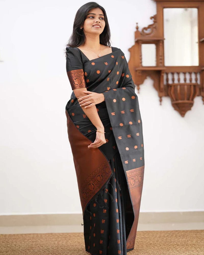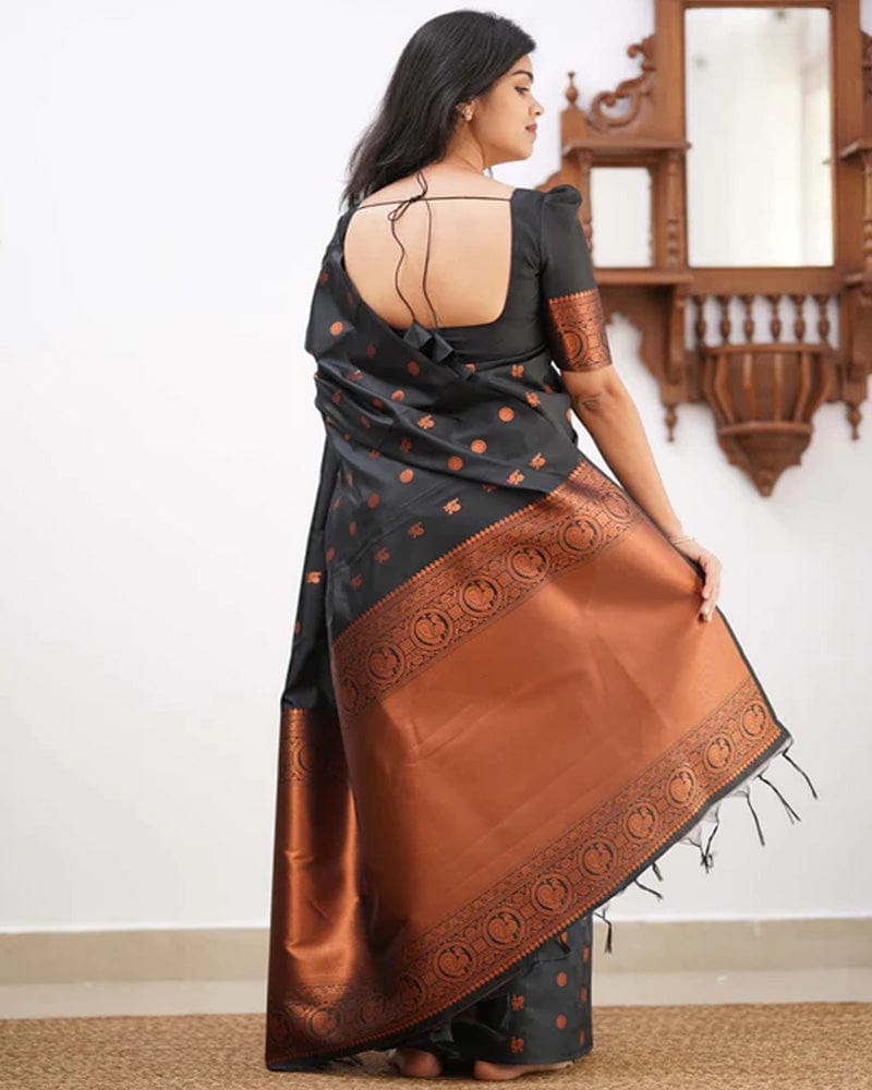 A striking black Banarasi jacquard soft silk saree, featuring intricate traditional weaving and a luxurious texture. Perfect for weddings, festive occasions, and cultural celebrations, this saree exudes timeless elegance and sophistication. Paired with an unstitched blouse piece, it allows for personalized tailoring to suit your unique style.