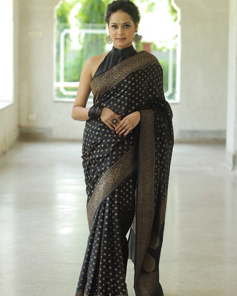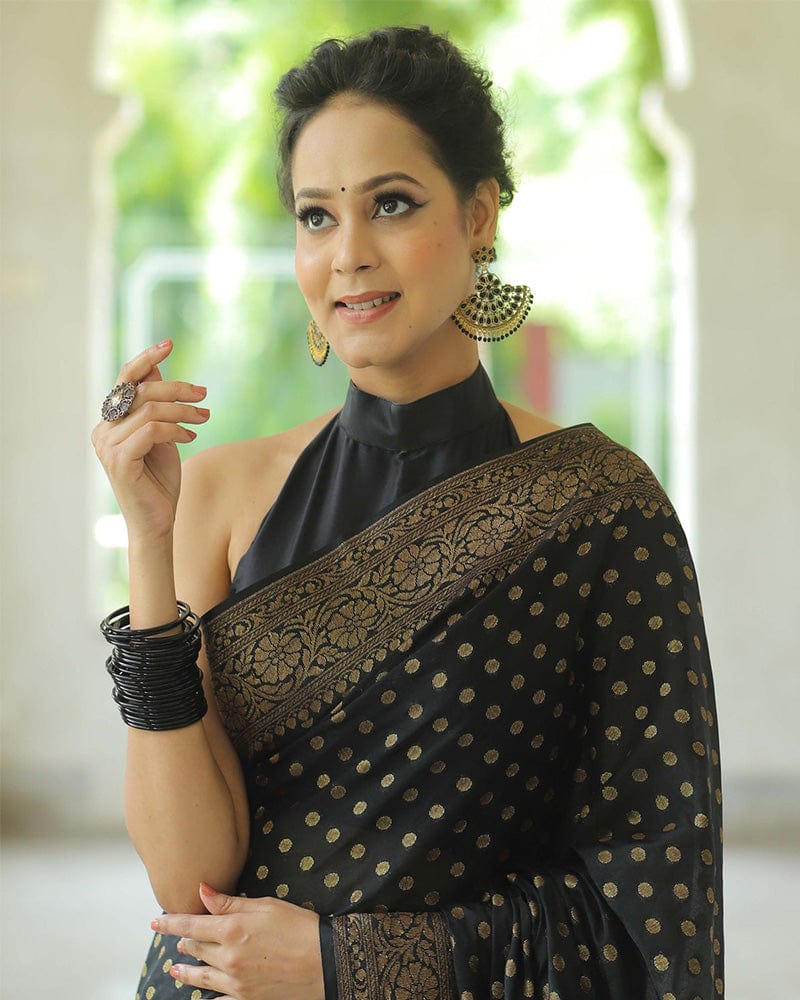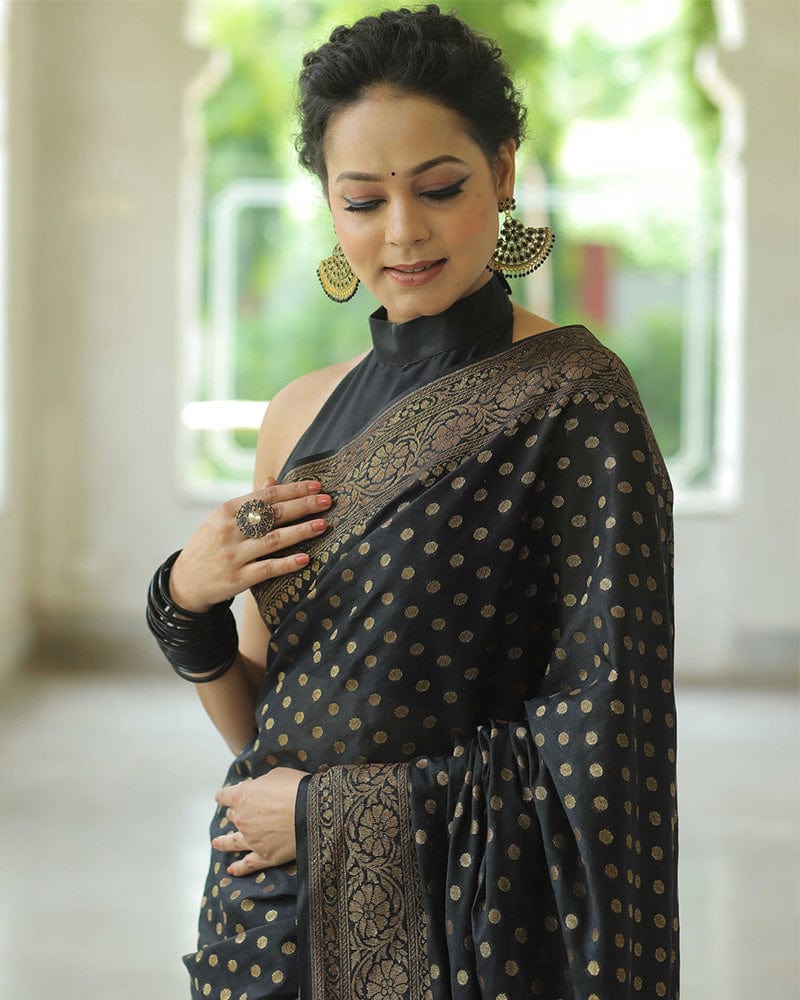 This stunning black Banarasi jacquard soft silk saree features intricate weaving and traditional motifs, offering a timeless and elegant appeal. Ideal for weddings, festive occasions, and grand celebrations, it exudes sophistication and charm. Accompanied by an unstitched blouse piece, it allows for personalized tailoring to create a perfect fit.