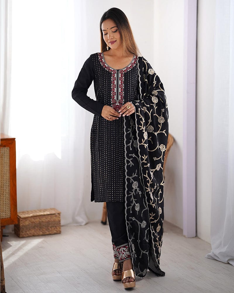 Elegant and timeless, this Black Color Chinon Silk Three Piece Kurti Suit features a beautifully crafted kurti, matching bottoms, and a stylish dupatta, perfect for festive events and special occasions. Soft silk fabric ensures a rich look with a comfortable feel.