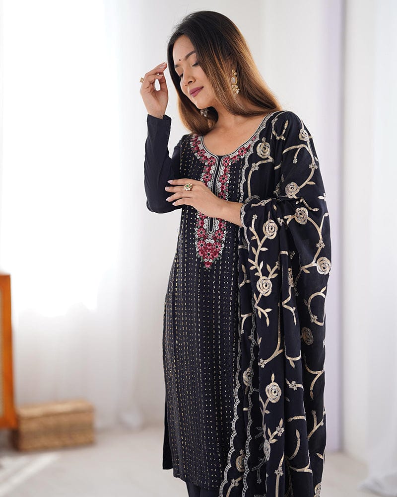 Elegant and timeless, this Black Color Chinon Silk Three Piece Kurti Suit features a beautifully crafted kurti, matching bottoms, and a stylish dupatta, perfect for festive events and special occasions. Soft silk fabric ensures a rich look with a comfortable feel.