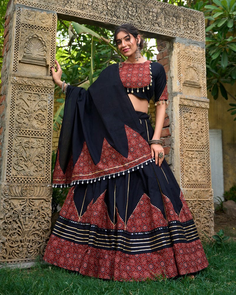 The Black Color Cotton Paper Mirror Work Navratri Lehenga Choli is a stunning traditional outfit perfect for festive celebrations. This ensemble features a black cotton lehenga adorned with intricate paper mirror work, reflecting the rich cultural heritage. Paired with a matching choli and dupatta, it offers a blend of elegance and festive charm, ideal for Navratri celebrations.