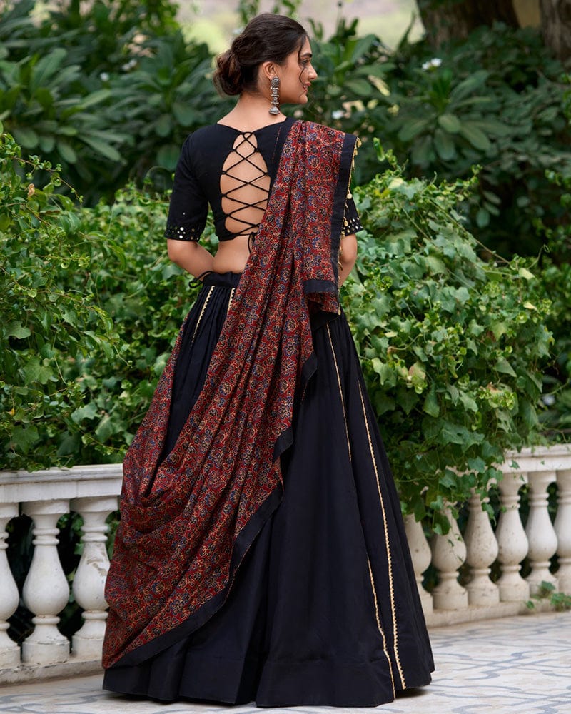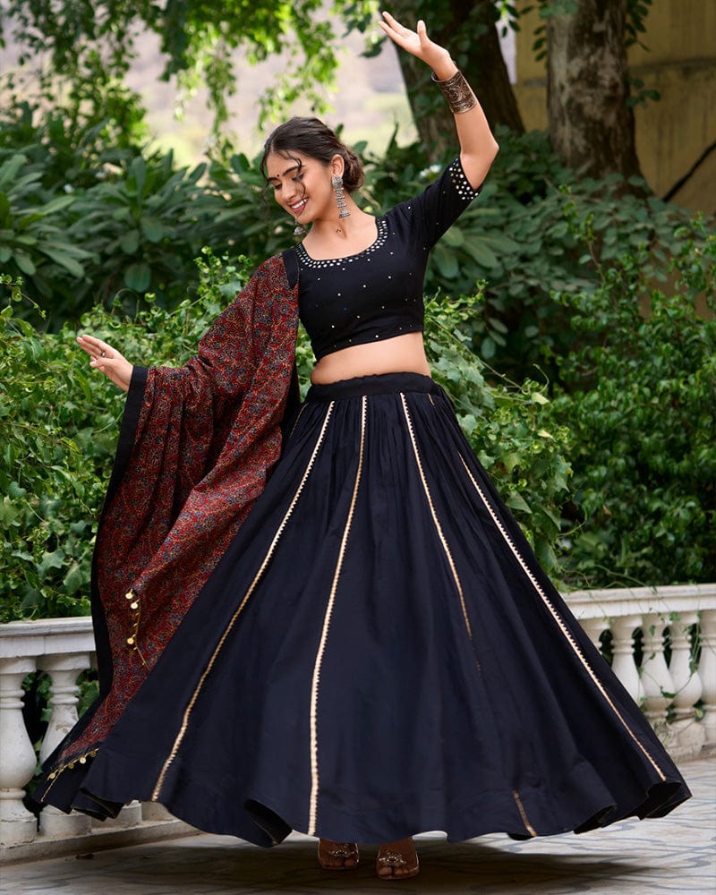 Celebrate Navratri in style with this Black Color Cotton Plain Lehenga Choli. Featuring a simple yet elegant design, this outfit comes with an unstitch blouse, allowing you to customize the fit to your liking. Perfect for festive occasions.