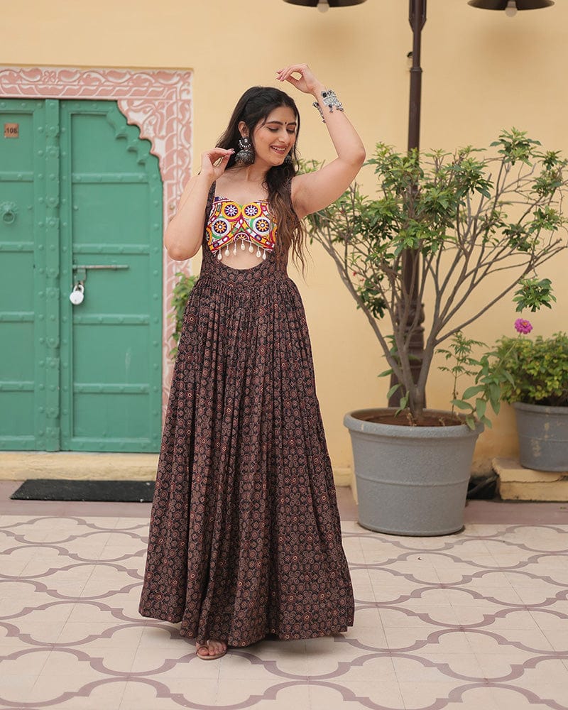 This Black cotton printed Navratri gown is the perfect blend of tradition and elegance. Featuring intricate prints, it offers both comfort and style, making it an ideal choice for festive celebrations. The soft cotton fabric ensures ease of wear, making it a must-have for Navratri.