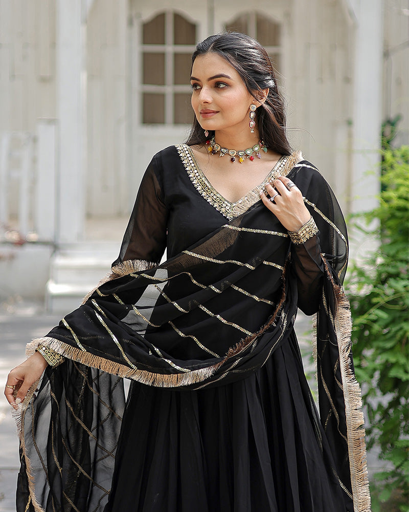 Embrace timeless sophistication in our Black Color Designer Fully Stitched Anarkali Gown. This exquisite ensemble effortlessly combines classic elegance with contemporary design. The deep black hue exudes a sense of mystery and refinement, while the fully stitched construction ensures a hassle-free and graceful silhouette. Adorned with tasteful designer details and embellishments, this gown is perfect for formal occasions, evening events, or celebrations. The Anarkali silhouette adds a touch of regality, allowing you to make a statement with every step. Elevate your style with the Black Color Designer Fully Stitched Anarkali Gown—a symbol of understated glamour and impeccable craftsmanship.