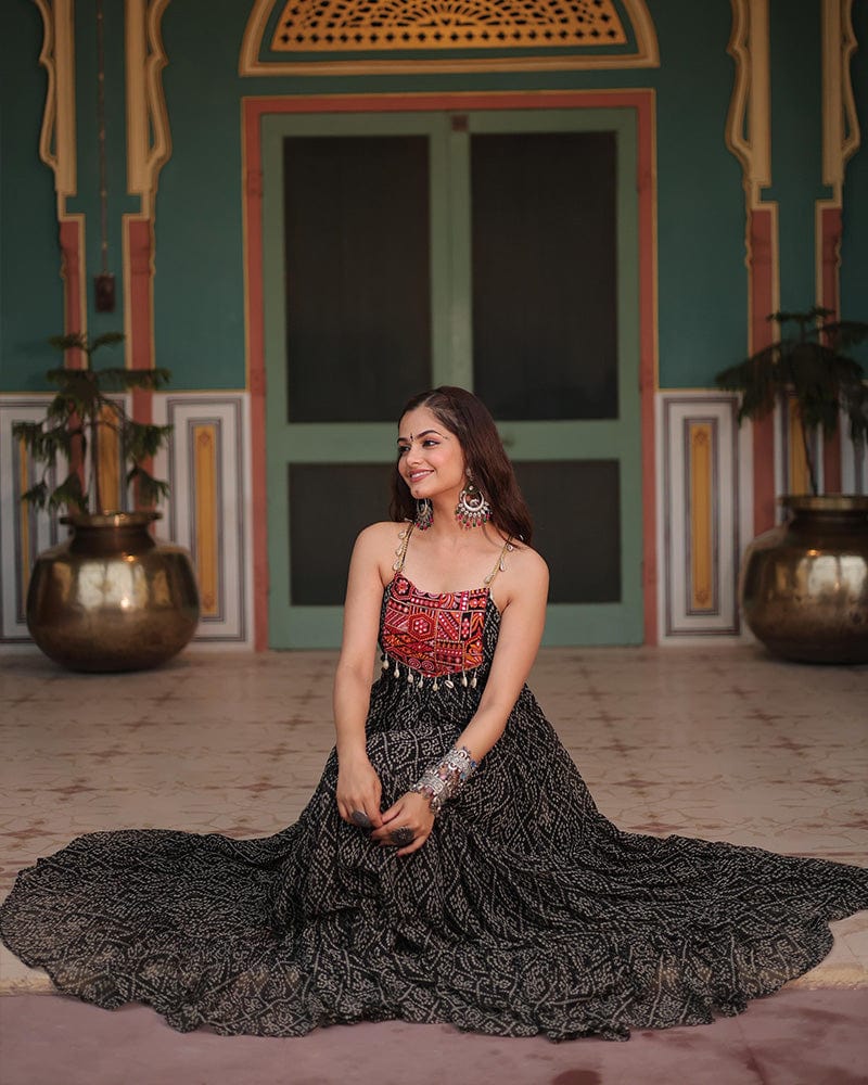 The Black Color Georgette Bandhej Print Navratri Gown is a stunning and sophisticated festive outfit. Crafted from lightweight and breathable georgette fabric, this gown features a classic black hue enhanced with traditional Bandhej print, offering a touch of ethnic elegance. The gown's flowing design and intricate detailing ensure comfort and style, perfect for dancing and celebrating Navratri. Combining cultural heritage with contemporary flair, this gown is designed to make a striking impression during the festivities.