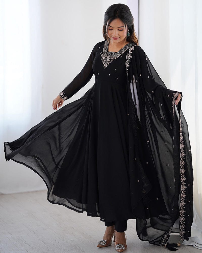 This black georgette three-piece Anarkali suit features intricate embroidery on a flowing silhouette, paired with a matching dupatta and bottom. Elegant and timeless, it's perfect for festive events, weddings, and evening occasions.
