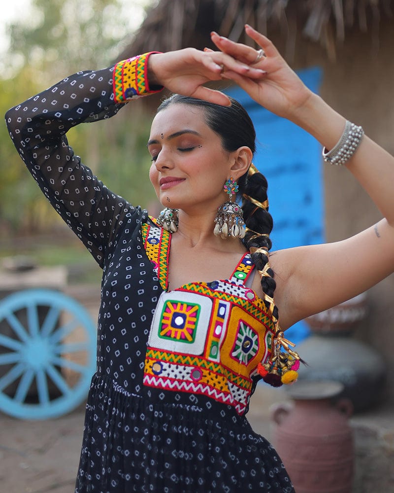 Here's a short description for the Black Color Georgette Full Flair Navratri Gown: Embrace elegance with this black georgette gown, designed with full flair for Navratri celebrations. Perfect for festive gatherings, its flowing silhouette and rich color promise a striking appearance.
