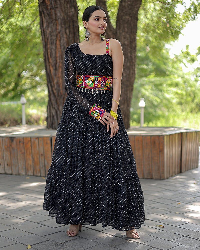 Celebrate Navratri in style with this Black Color Georgette Laheriya Print Gown. This elegant gown features traditional Laheriya prints on flowing georgette fabric, creating a mesmerizing look perfect for festive occasions. The lightweight and comfortable material ensures ease of movement, making it an ideal choice for dancing the night away.