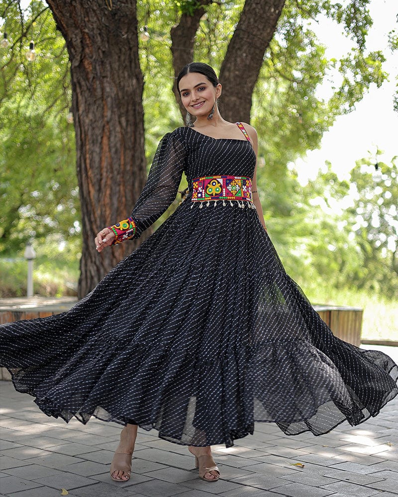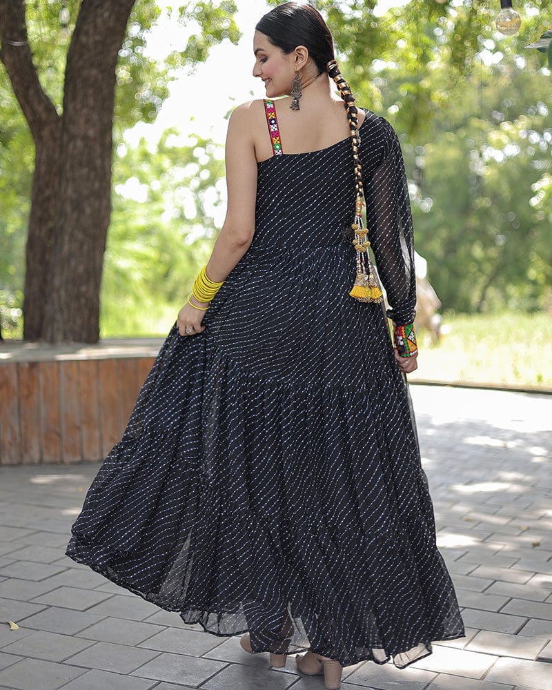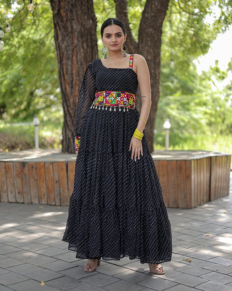 Celebrate Navratri in style with this Black Color Georgette Laheriya Print Gown. This elegant gown features traditional Laheriya prints on flowing georgette fabric, creating a mesmerizing look perfect for festive occasions. The lightweight and comfortable material ensures ease of movement, making it an ideal choice for dancing the night away.