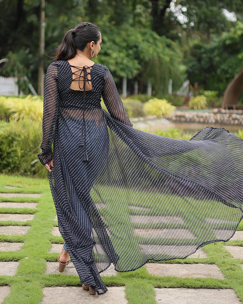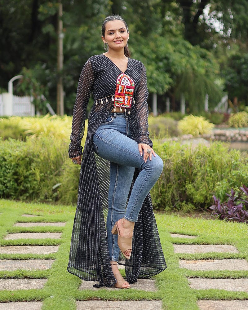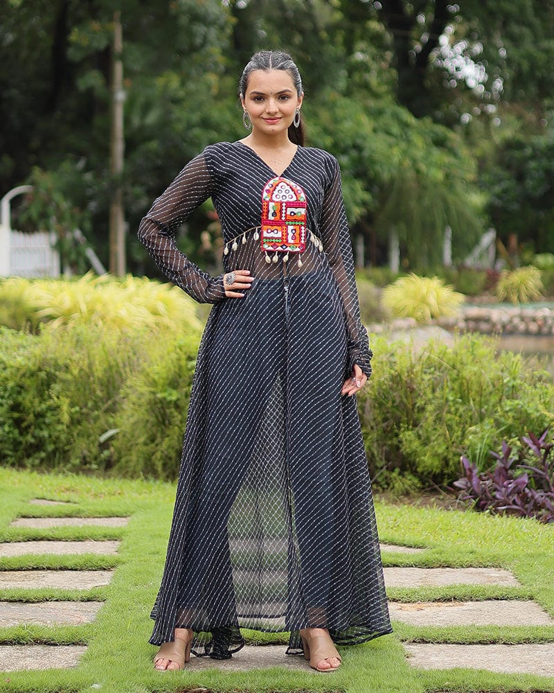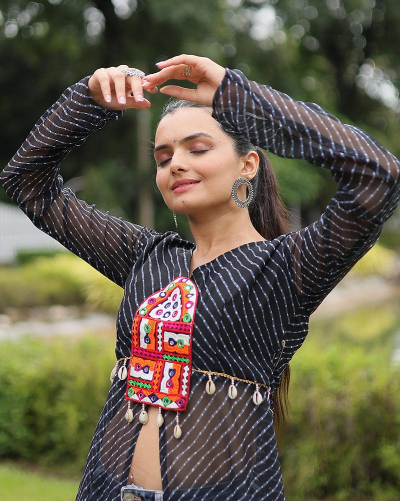 This black-colored Navratri kurti, made from flowing georgette fabric, features a dynamic Laheriya print. Perfect for festive occasions, this kurti combines a bold color with traditional patterns, creating a sophisticated and stylish look for Navratri.