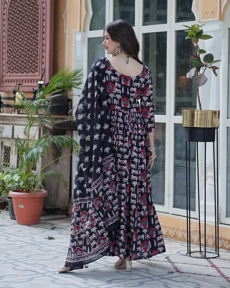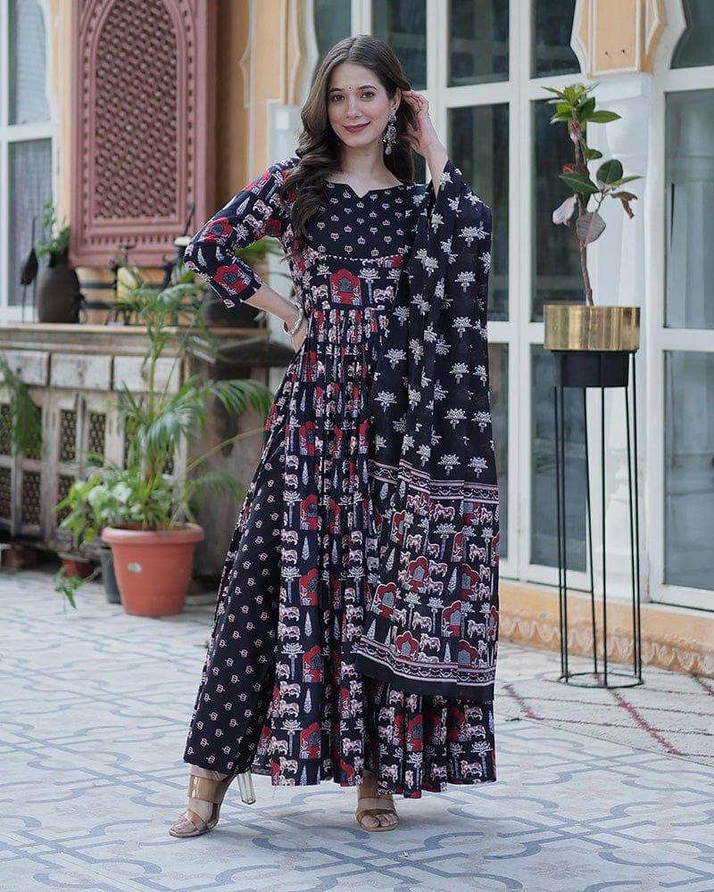 Stylish black printed pure cotton three-piece kurti suit, featuring a comfortable fit and elegant design. Perfect for casual and festive wear.