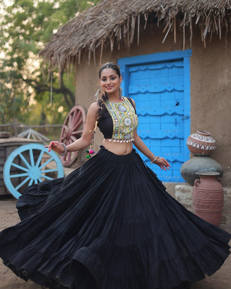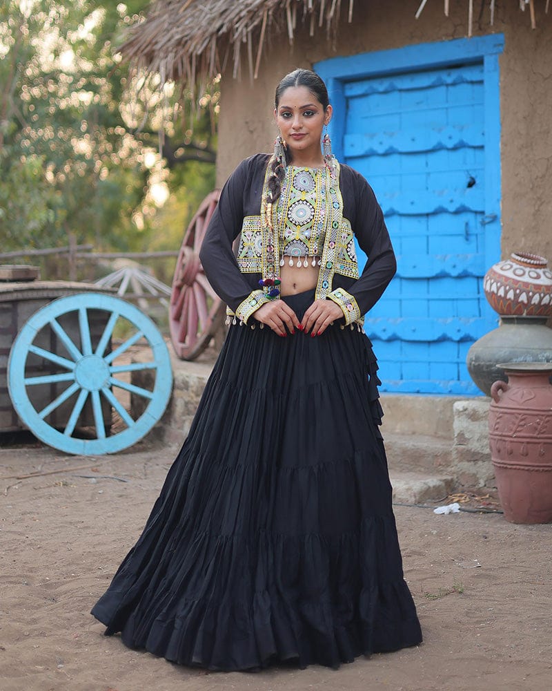 This black-colored Navratri lehenga choli, crafted from soft rayon fabric, features exquisite embroidery that enhances its festive appeal. Ideal for Navratri celebrations, this ensemble combines traditional elegance with contemporary style, ensuring you stand out during the festivities.