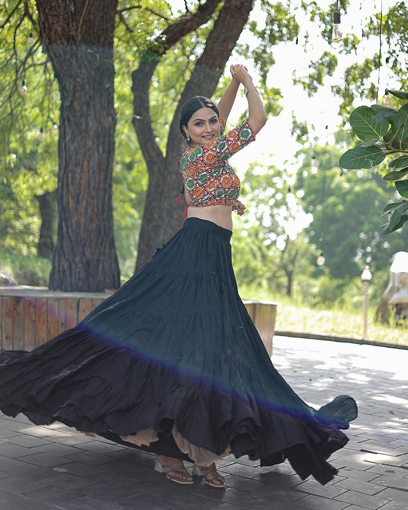Introducing the Black Color Rayon Full Flair Navratri Lehenga Choli, a stunning ensemble perfect for the festive season. Made from high-quality rayon fabric, this lehenga choli features a full flair design that adds a touch of elegance and drama to your Navratri celebrations. The rich black color enhances its sophistication, making you the center of attention at any event.
