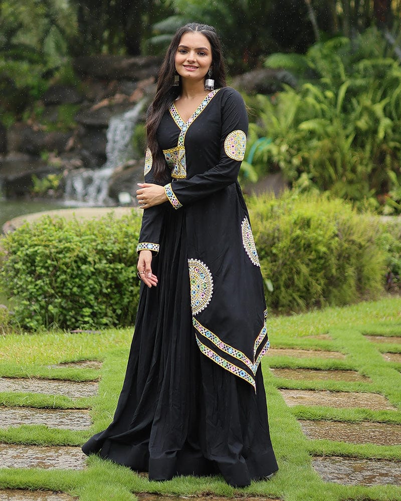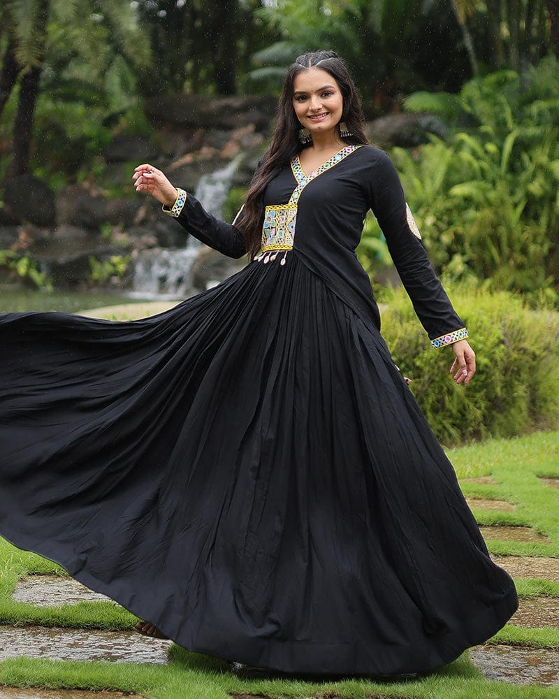 Embrace the festive spirit with this stunning black rayon gown, designed in traditional Kutchi style. The intricate detailing and elegant drape make it a perfect choice for celebrating Navratri in style and grace.