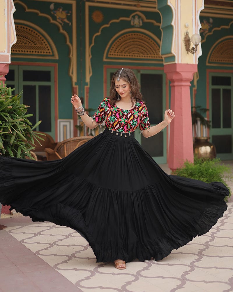 The Black Color Rayon Navratri Gown is a stylish and comfortable choice for festive celebrations. Crafted from soft and breathable rayon fabric, this gown features a classic black hue that exudes elegance and versatility. Its flowing silhouette and intricate detailing make it perfect for dancing and enjoying the Navratri festivities. Combining traditional charm with modern design, this gown ensures you make a striking impression during the celebrations.