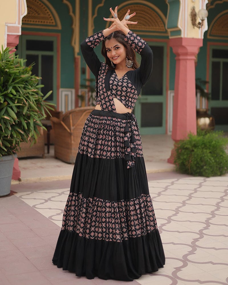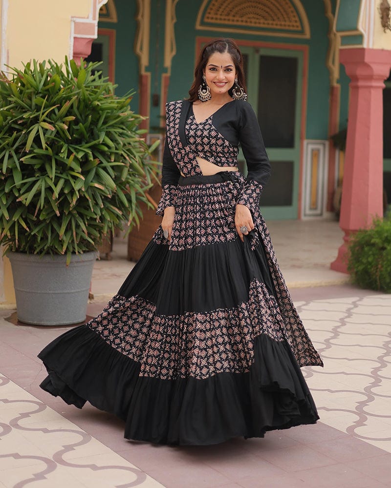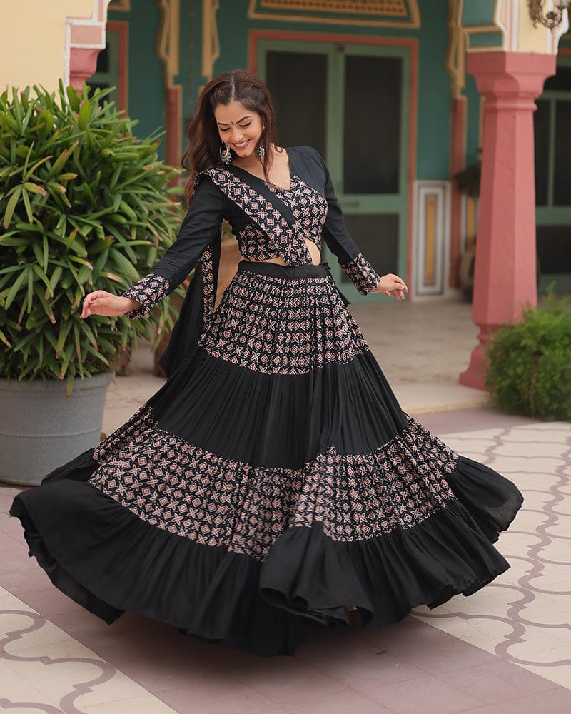 This striking black lehenga choli, crafted from comfortable rayon fabric, is designed specifically for Navratri. Combining traditional style with a modern touch, this ensemble is perfect for festive celebrations, offering both elegance and ease.