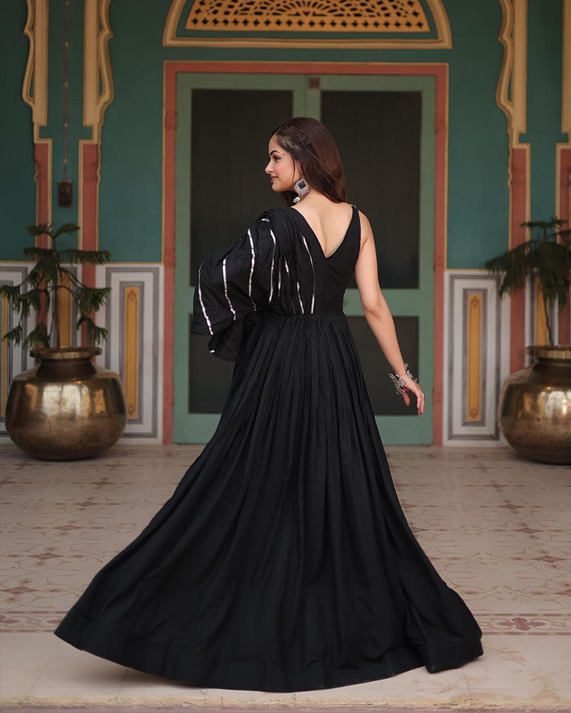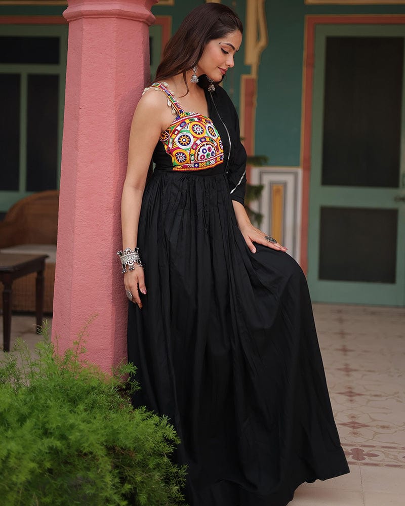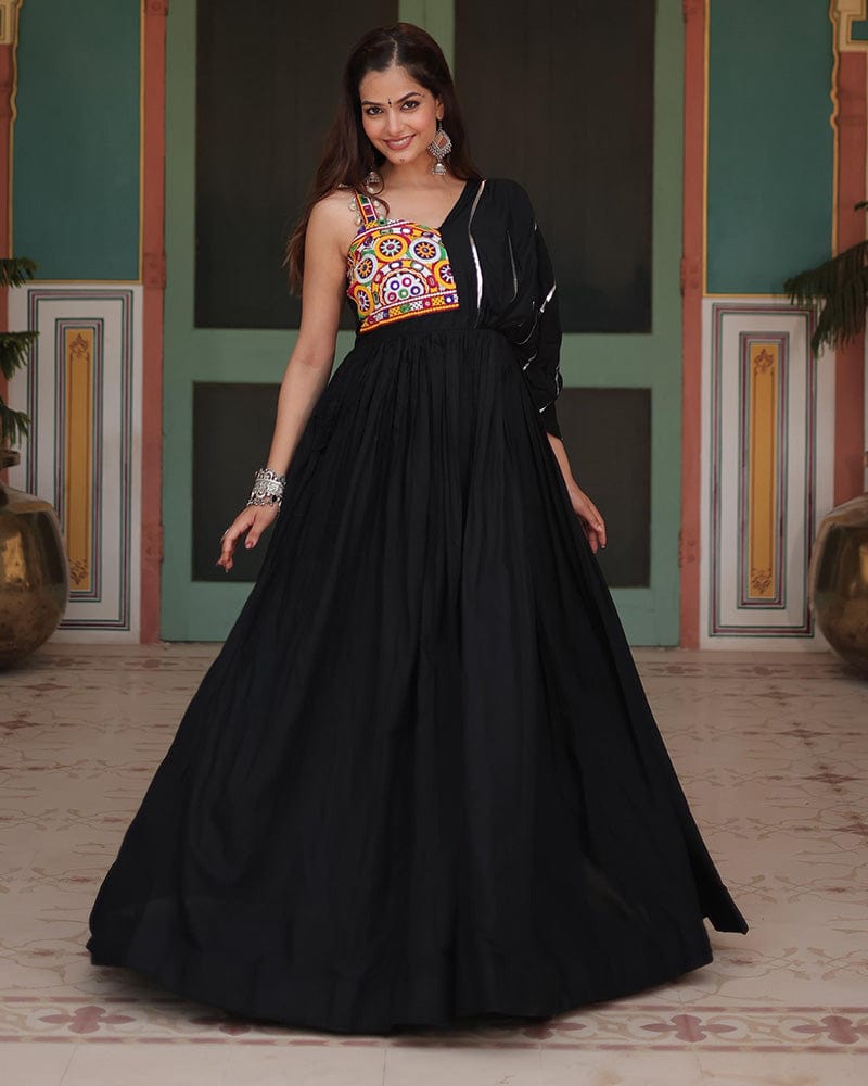 This striking black gown, crafted from comfortable rayon fabric, is adorned with intricate Gamthi work, reflecting traditional artistry. Perfect for Navratri celebrations, this gown combines cultural richness with modern elegance, making it a standout choice for the festive season.