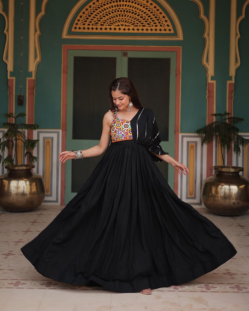 This striking black gown, crafted from comfortable rayon fabric, is adorned with intricate Gamthi work, reflecting traditional artistry. Perfect for Navratri celebrations, this gown combines cultural richness with modern elegance, making it a standout choice for the festive season.