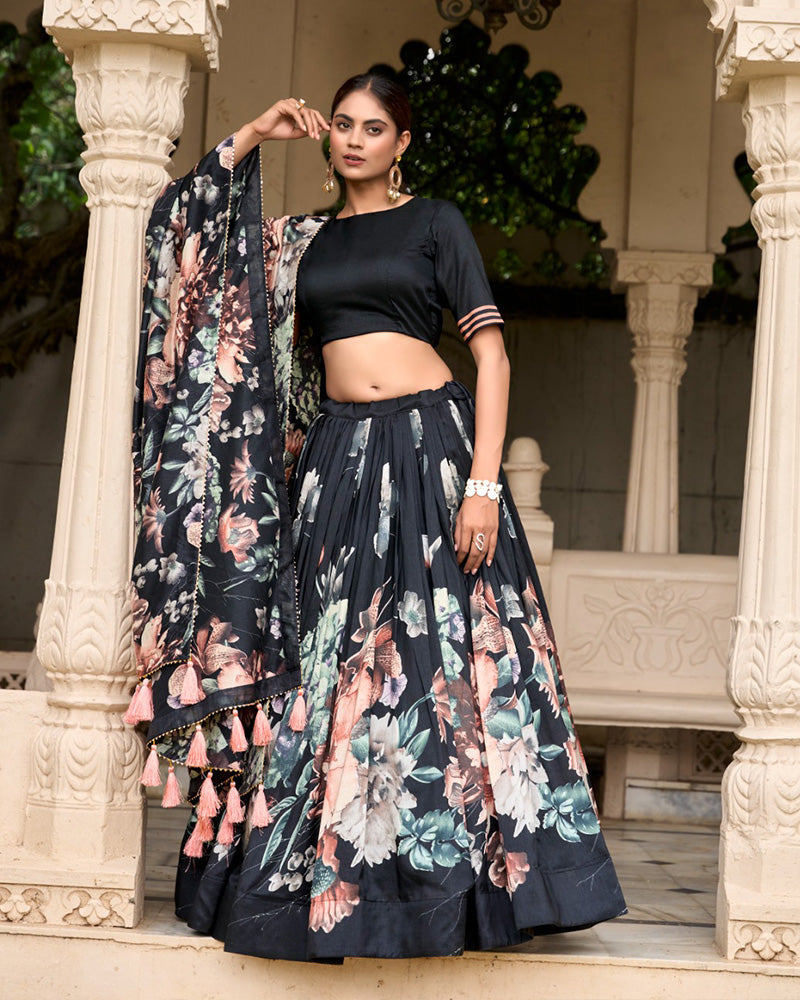 Black Color Tussar Silk Floral Printed Lehenga Choli