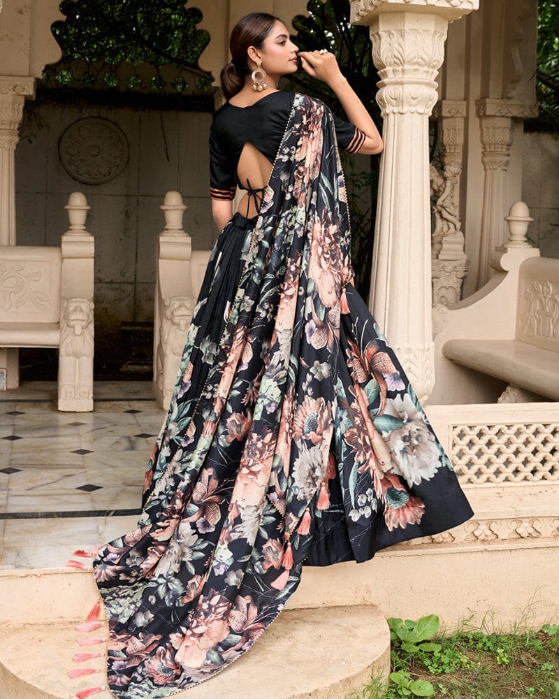Black Color Tussar Silk Floral Printed Lehenga Choli