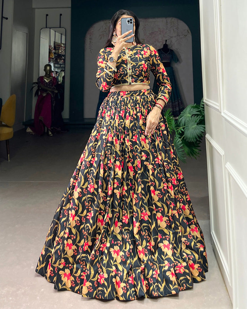 Make a statement with this Black Tussar Silk Printed Lehenga Choli. Crafted from luxurious tussar silk, the lehenga features an elegant printed design that adds a touch of sophistication. Perfect for festive celebrations, weddings, or special events, this ensemble exudes timeless charm and refined style.
