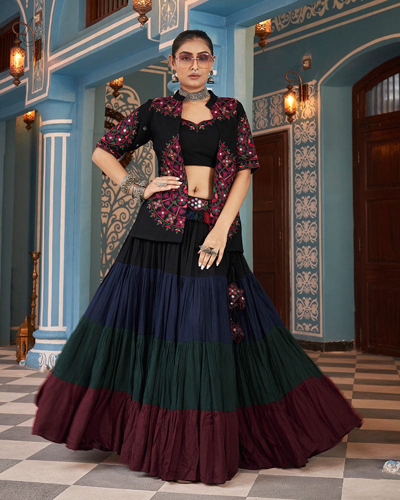 Elevate your festive wardrobe with this black viscose rayon Navratri lehenga choli. The sleek design and comfortable fabric make it an ideal choice for the celebrations.