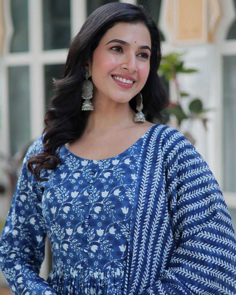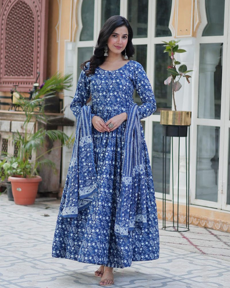 Graceful Blue Color Printed Pure Cotton Three-Piece Kurti Suit featuring breathable fabric and elegant prints. Perfect for casual and festive wear, offering comfort with a touch of traditional charm.