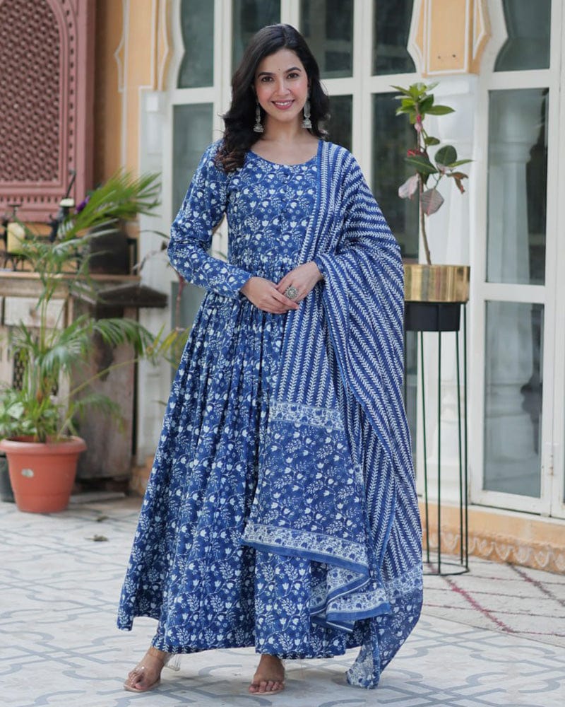 Blue Color Printed Pure Cotton Three Piece Kurti Suit
