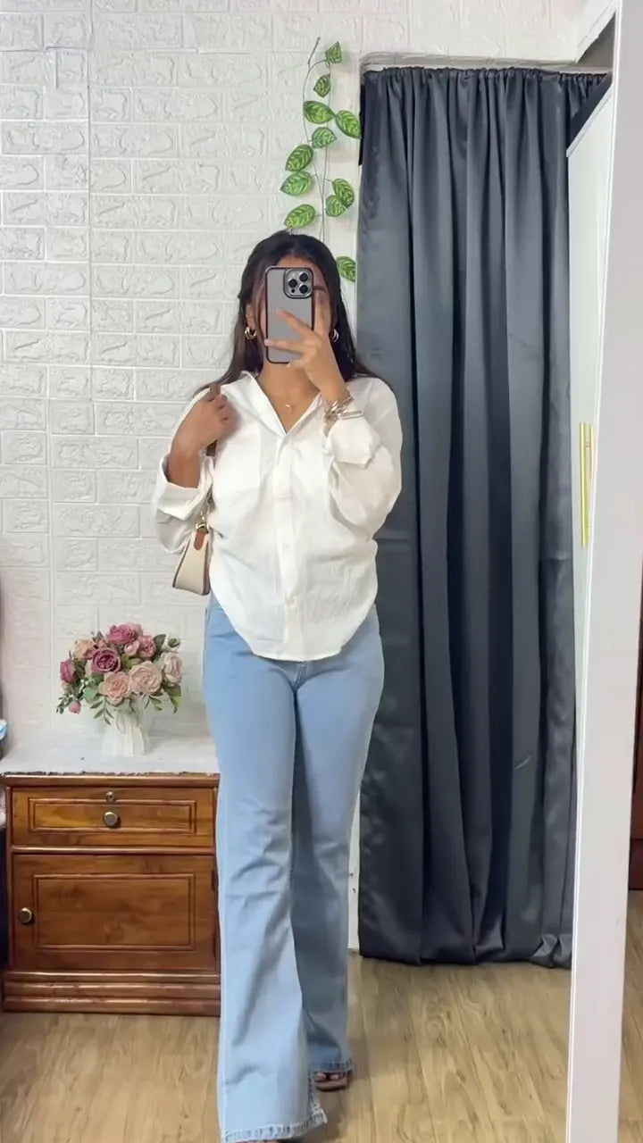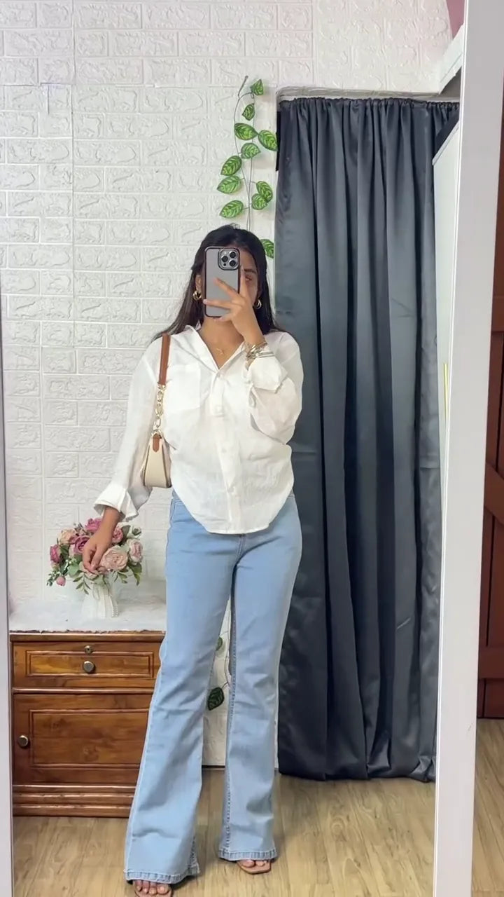 Keeping it simple yet stylish 🌸 – a crisp white shirt paired with light blue flared jeans for that timeless casual vibe. Perfect for brunch dates, shopping sprees, or just a cozy day out. 🤍👖✨