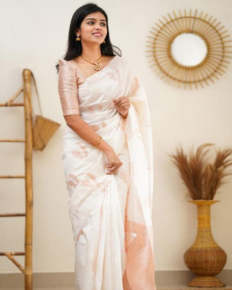 An elegant Banarasi soft silk saree in a refined copper-white shade, adorned with intricate traditional motifs and luxurious weaving. Paired with an unstitched blouse piece, it offers the flexibility for custom tailoring. Perfect for weddings, festive events, and cultural celebrations, this saree exudes timeless beauty and sophistication.