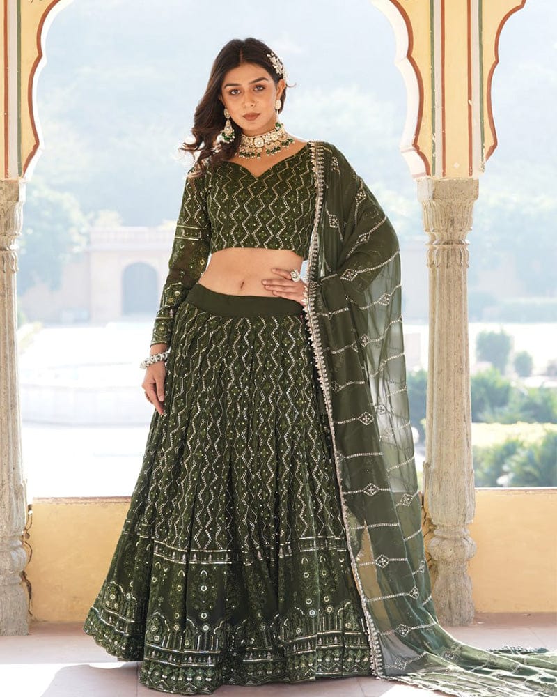 Dark Green Color Georgette Heavy Embroidery Threaded Semi Stitched Lehenga Choli