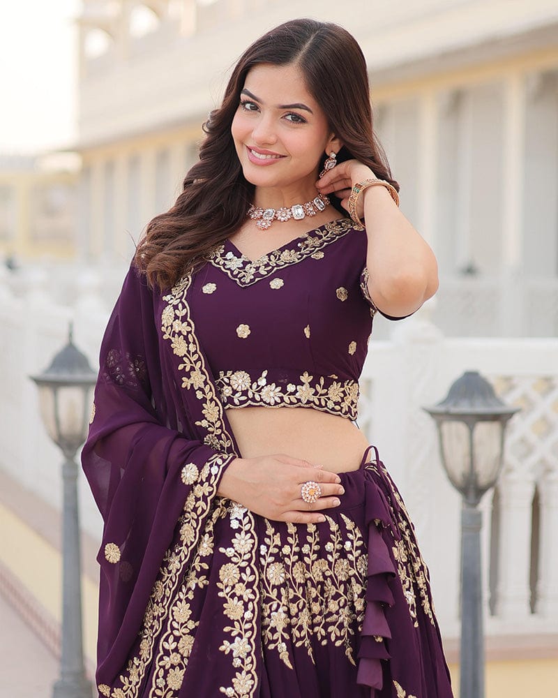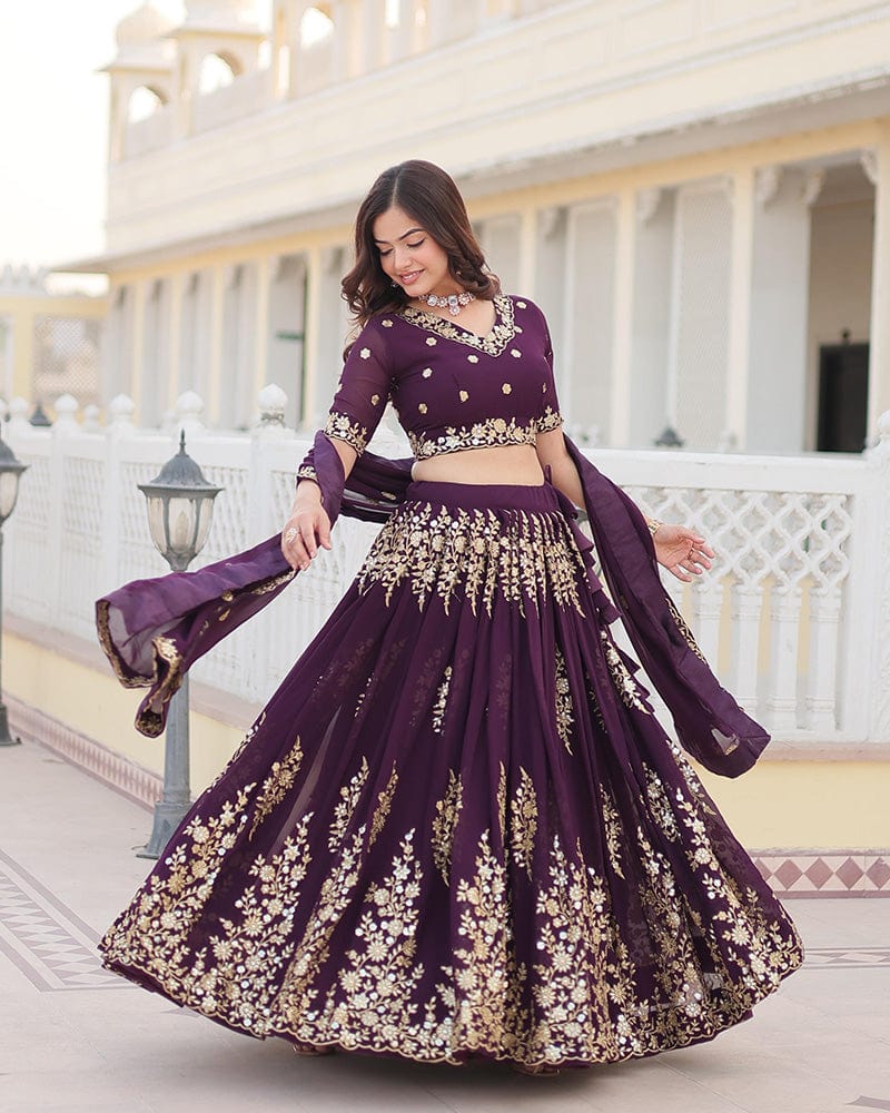 Exude elegance with this Deep Violet Color Georgette Sequence Embroidery Lehenga Choli. Crafted from luxurious georgette, this lehenga is adorned with intricate sequin embroidery that adds a touch of sparkle and sophistication. Paired with an unstitch blouse for a custom fit, this ensemble is perfect for special occasions. Combining traditional charm with contemporary style, this lehenga choli ensures you stand out beautifully.