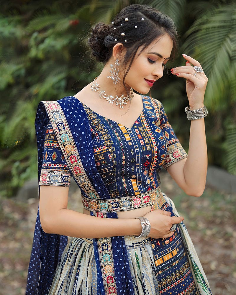 Designer Blue-Off White Color Cotton Printed Lehenga Choli