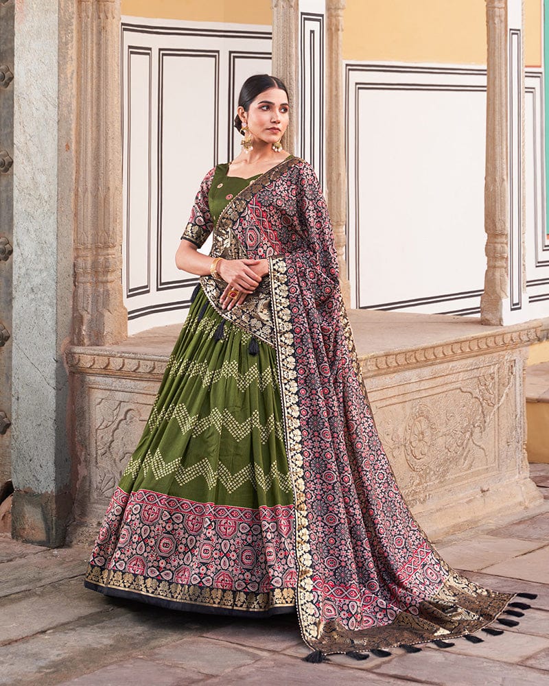 Designer Green Color Ajarakh Print Silk Lehenga Choli
