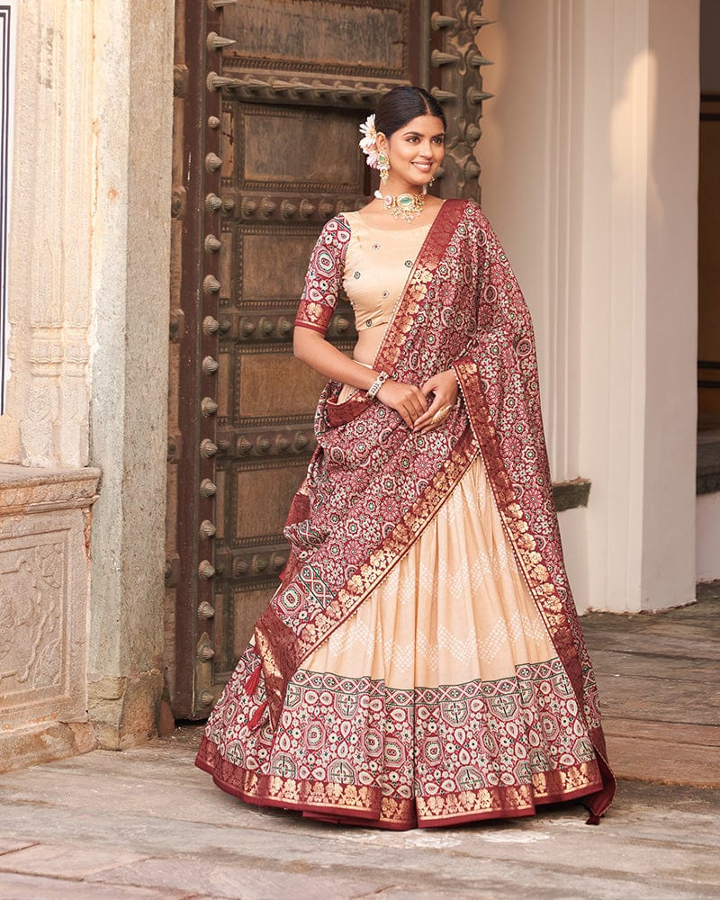 Designer Off White Color Ajarakh Print Silk Lehenga Choli