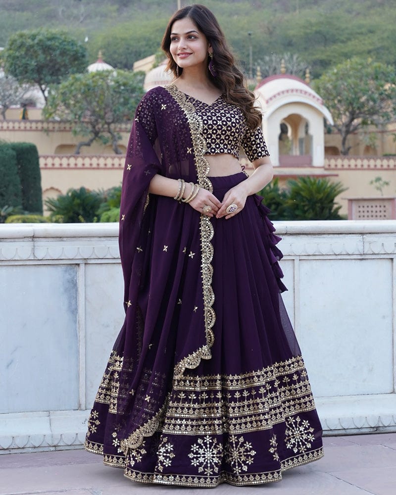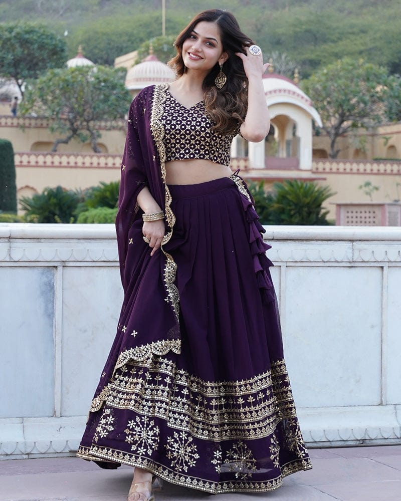 Designer Sequence Embroidery Work Georgette Lehenga Choli In Wine Color