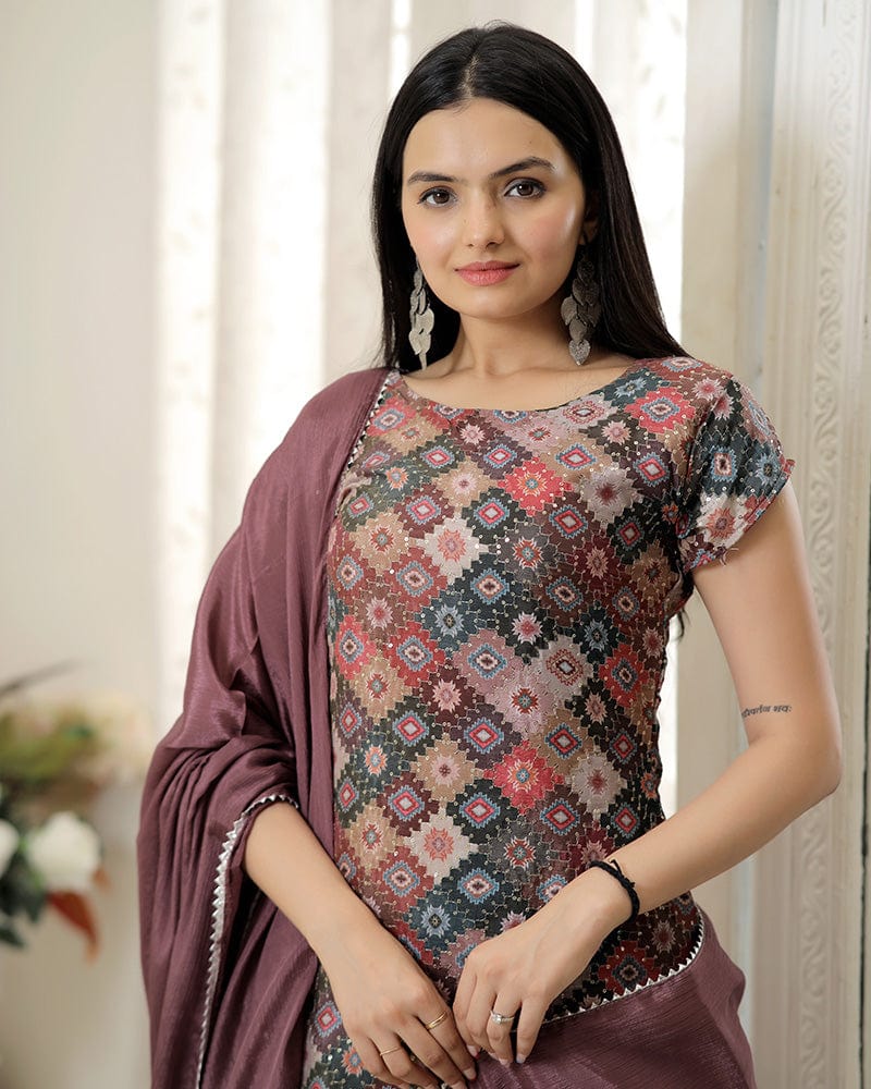 Elegance meets subtlety in our Dusty Pink Color Three-Piece Designer Palazzo Suit. The soft and muted pink hue lends a touch of sophistication to this ensemble. The intricately designed kurta showcases meticulous detailing and embellishments, striking a perfect balance between tradition and contemporary style. Paired gracefully with wide-legged palazzo pants, the outfit ensures comfort without compromising on fashion. The ensemble is completed with a designer dupatta, adding an extra layer of charm and allure. Ideal for special occasions and celebrations, the Dusty Pink Color Three-Piece Designer Palazzo Suit is a reflection of refined aesthetics and modern appeal, making you stand out with grace and poise.