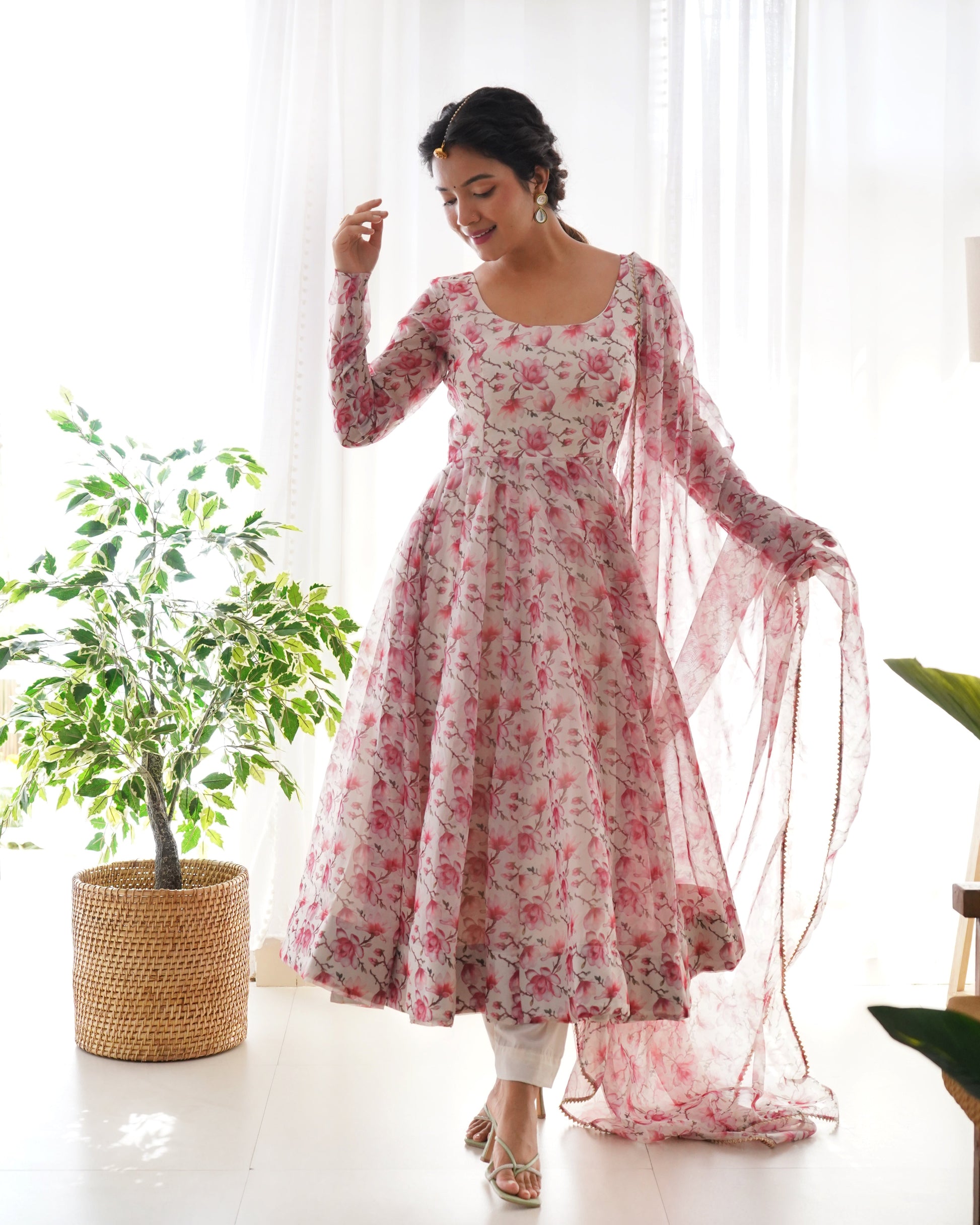 Floral Rose Print White Colour Organza Three Piece Anarkali Suit