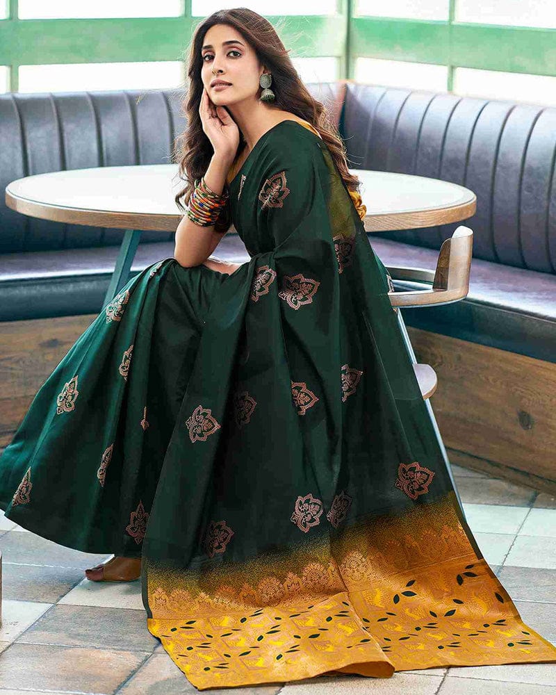 Graceful and timeless, this Green Banarasi Jacquard soft silk saree features exquisite jacquard detailing, offering a perfect blend of tradition and style. Paired with an unstitched blouse piece, it’s ideal for weddings, festivals, and celebratory events.