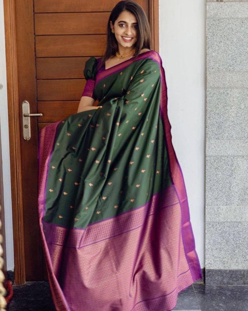 A beautiful green Banarasi soft silk saree, adorned with intricate traditional weaving and rich detailing. Perfect for weddings, festive occasions, and cultural celebrations, this saree exudes elegance and timeless beauty. Paired with an unstitched blouse piece, it allows for customized tailoring to create a personalized look.