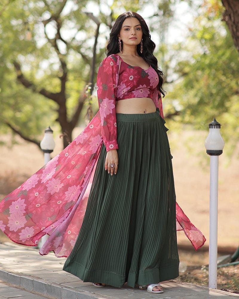 This Green Color Faux Georgette Lehenga Choli is a captivating ensemble ideal for festive and special events. Crafted from premium faux georgette fabric, the lehenga boasts intricate detailing and a graceful silhouette. Paired with a matching choli, this outfit combines elegance and vibrancy, making it a perfect choice for making a stylish statement.