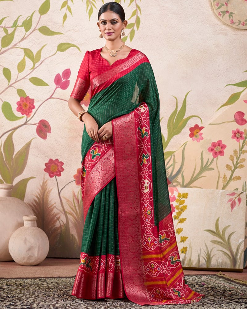 Add a touch of sophistication to your wardrobe with this green tussar chex saree. Crafted from luxurious tussar silk, it features a chic check pattern that blends traditional aesthetics with contemporary style. The accompanying unstitch blouse allows for a tailored fit, making it perfect for festive occasions or casual gatherings. Effortlessly elegant, this saree is a must-have for any fashionista.