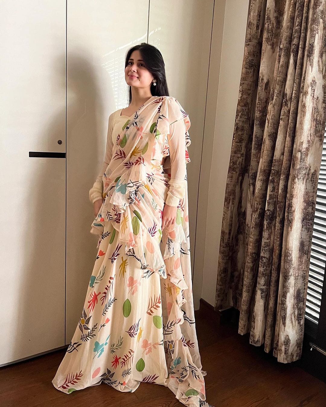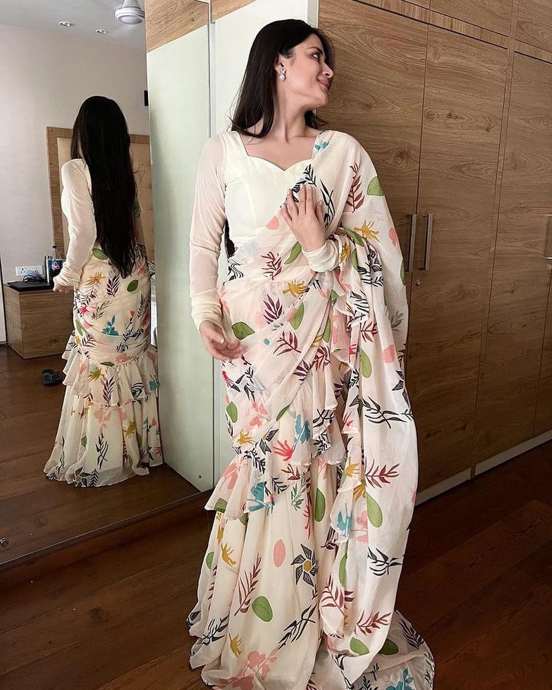 Beautiful @gunjan_kunwar99 ❤️ in printed soft Georgette ruffle ready-to-wear skirt saree combines the elegance of a traditional saree with the convenience of a skirt. Made from lightweight Georgette fabric, it features delicate prints and cascading ruffles, creating a graceful and modern look. With no pleats to arrange, it's a hassle-free option for those who want to adorn a saree effortlessly. Perfect for special occasions or events where you want to make a stylish statement.