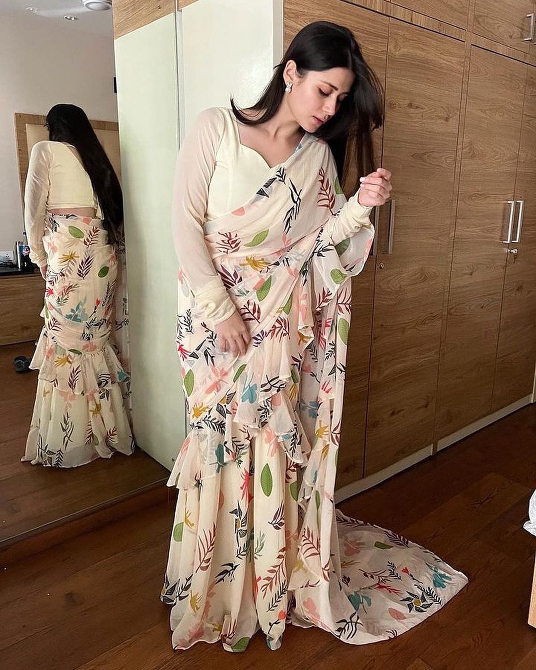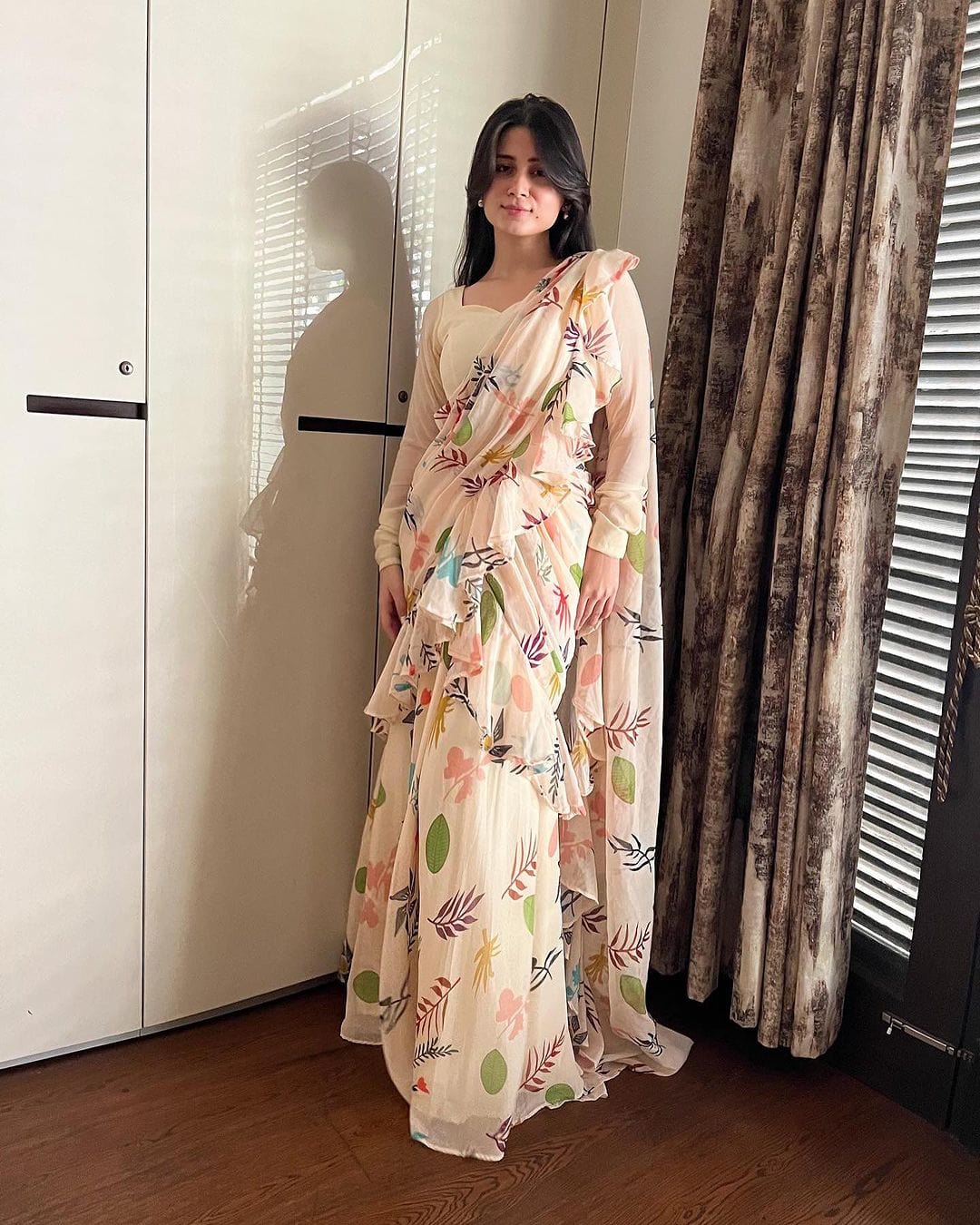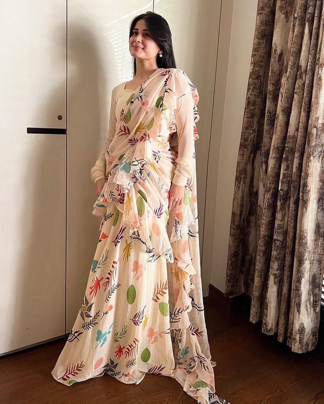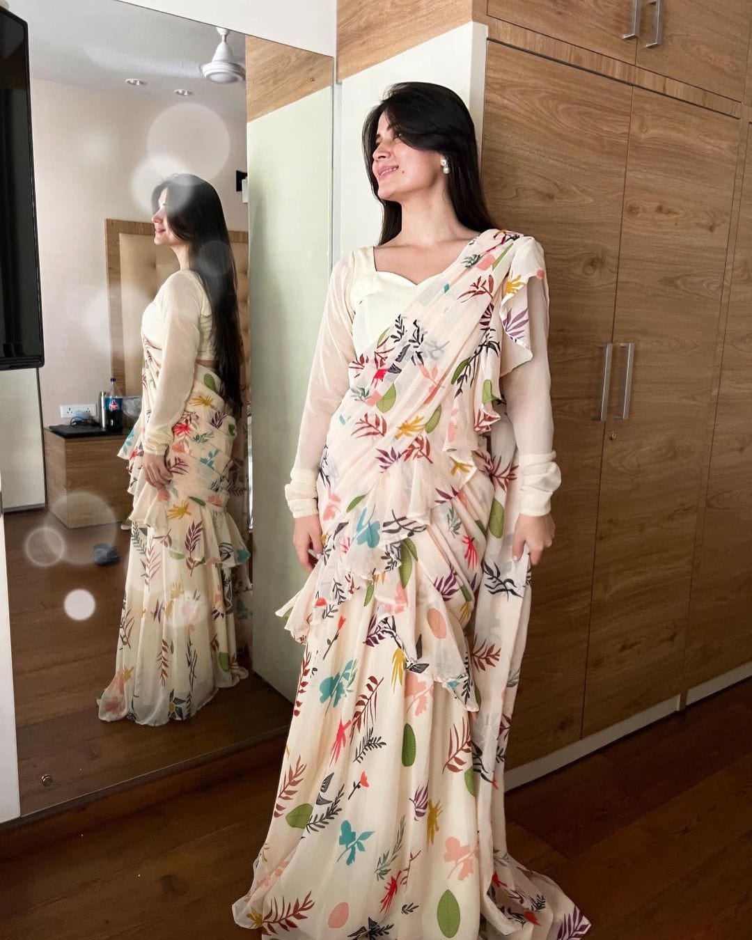 Beautiful @gunjan_kunwar99 ❤️ in printed soft Georgette ruffle ready-to-wear skirt saree combines the elegance of a traditional saree with the convenience of a skirt. Made from lightweight Georgette fabric, it features delicate prints and cascading ruffles, creating a graceful and modern look. With no pleats to arrange, it's a hassle-free option for those who want to adorn a saree effortlessly. Perfect for special occasions or events where you want to make a stylish statement.