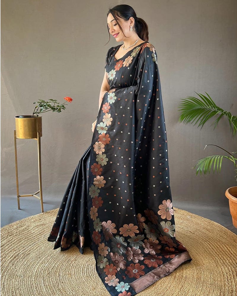 Indulge in timeless elegance with our Jacquard Design Black Lichi Silk Saree. Crafted with meticulous attention to detail, this saree exudes sophistication with its intricate jacquard design. The rich black hue adds a touch of glamour, perfect for any occasion. Made from soft lichi silk, it drapes beautifully and feels luxurious against the skin. Paired with an unstitched blouse, this saree offers versatility in styling, allowing you to create your own unique look. Elevate your wardrobe with this exquisite ensemble that seamlessly blends tradition and modernity.