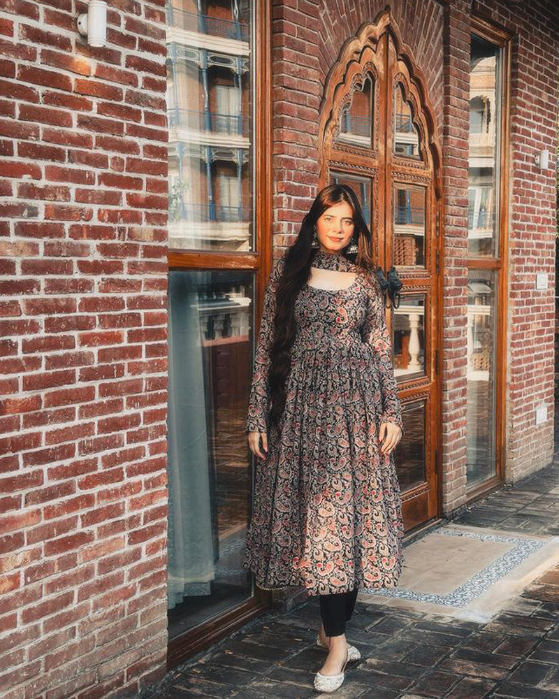 The Mango Kalamkari Printed Full Stitched Three Piece Anarkali Suit is a beautifully designed ethnic outfit that exudes grace and elegance. This three-piece ensemble includes a full-length Anarkali dress, bottoms (salwar or churidar), and a matching dupatta. The suit comes fully stitched, saving you the hassle of tailoring, and is available in various sizes for a comfortable fit. The flowing Anarkali style flares from the waist down, adding a regal touch to the attire. The bottoms complement the dress beautifully, and the coordinating dupatta completes the look, adding an element of finesse.